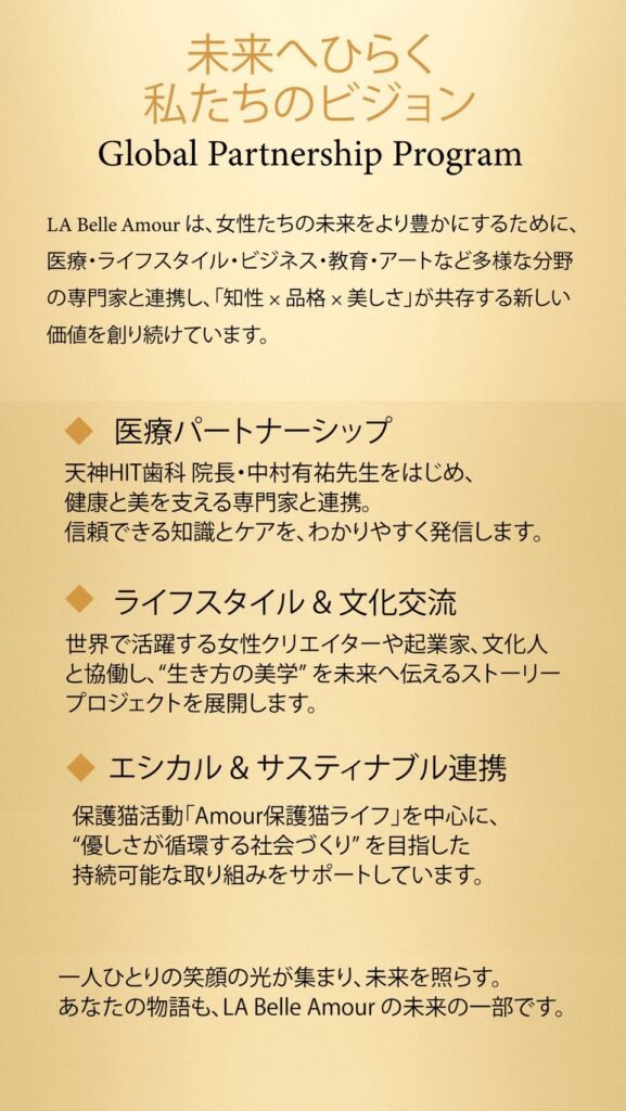LABelleAmourは、女性たちの未来をより豊かにするために、 医療・ライフスタイル・ビジネス・教育・アートなど多様な分野 の専門家と連携し、